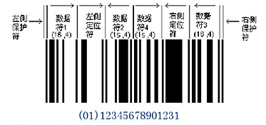 开头的(01)是隐含的应用标识符,不在符号中编码。最后一位数字1是校验符,不在符号中编码,符号分为四个段,可以分段扫描和译码,然后再重组。
