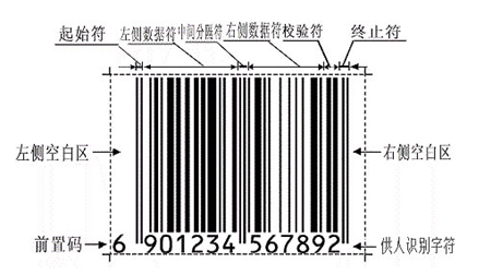 商品条码是指由一组规则排列的条、空及其对应字符(阿拉伯数字)组成的标识,由国际物品编码协会指定,通用于世界各地。是目前国际上使用最广泛的一种商品条形码。EAN商品条码一般由前缀码(前3位)、制造厂商代码(4-8位)、商品代码(9-12位)以及校验码(13位)组成,是在1991年4月(除港、澳、台地区)加入国际物品编码协会,之后在国内推行使用EAN商品条码,EAN商品条码的组成结构如下图所示: